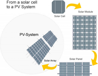 PV cells are small squares, approximately 4 inches wide, which absorb light and convert it into electricity through a chemical reaction. PV cells are arranged in sets (anywhere from 24 to 42 cells) to form modules, and modules in turn are combined to form panels. A series of panels is referred to as an array, and the entire array is securely mounted to the roof or the ground.