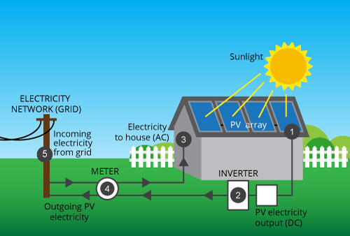 Most PV systems today are grid-tied (also known as grid-connected). This means that the surplus electricity these systems create can be directed into the larger electrical grid. Grid-tied systems contain a utility meter through which the current must flow to reach the grid. The current first passes through an inverter, which converts DC into AC. Then any AC current that is not used locally goes into the grid through the meter.