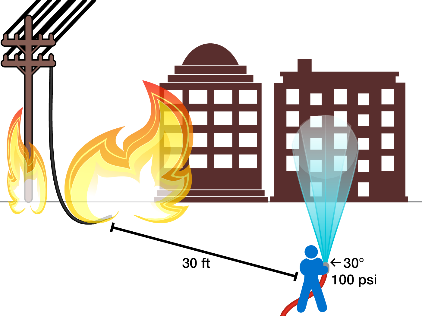 Remember the 30/30/100 rule when protecting exposures during fires that involve electrical equipment: Stay at least 30 feet away from energized objects, and use a 30-degree fog pattern at 100 psi, NEVER a straight stream.